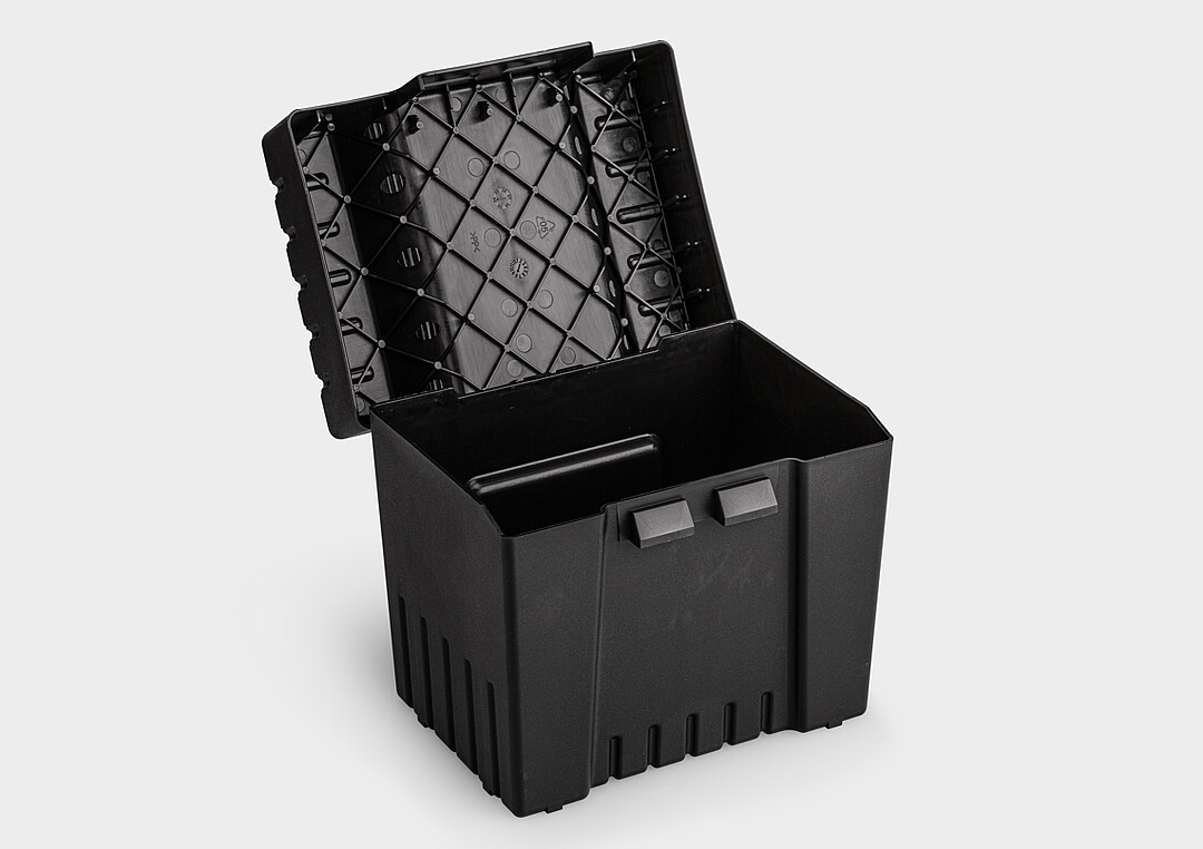 - Ergonomically shaped handle allows carrying the box close to the body, thus protecting the back